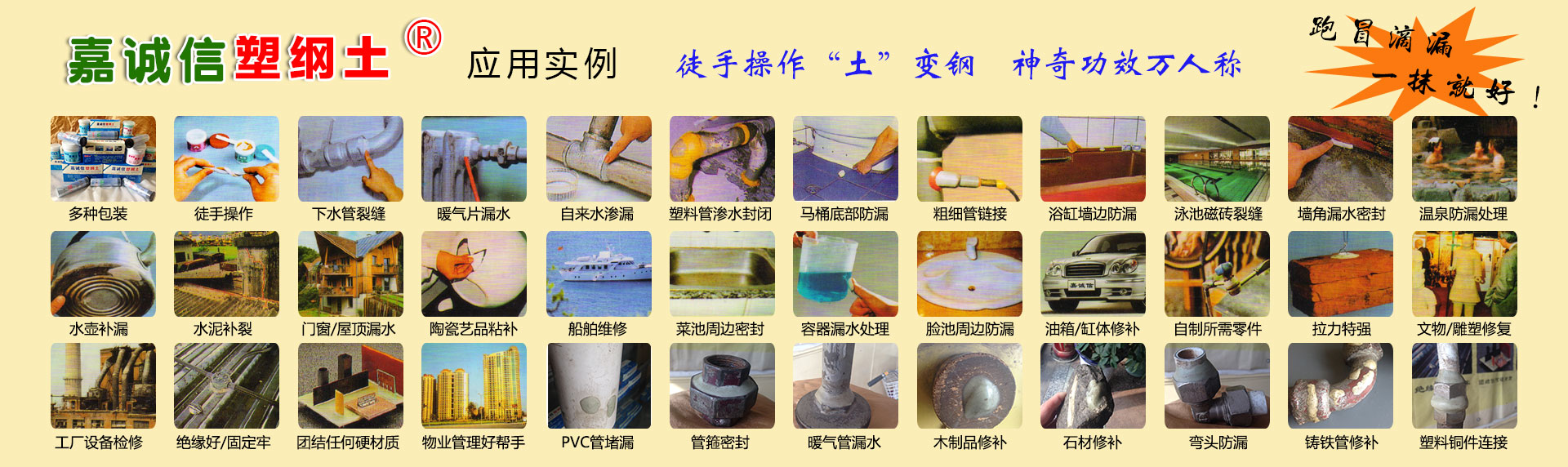 山西嘉誠(chéng)信是中國(guó)塑鋼土品牌產(chǎn)品的合法專業(yè)廠家,《嘉誠(chéng)信塑鋼土》是中國(guó)正宗合法之塑鋼土!其他任何人、任何廠家商家號(hào)稱的所謂“塑鋼土”均為假冒偽劣侵權(quán)之貨!